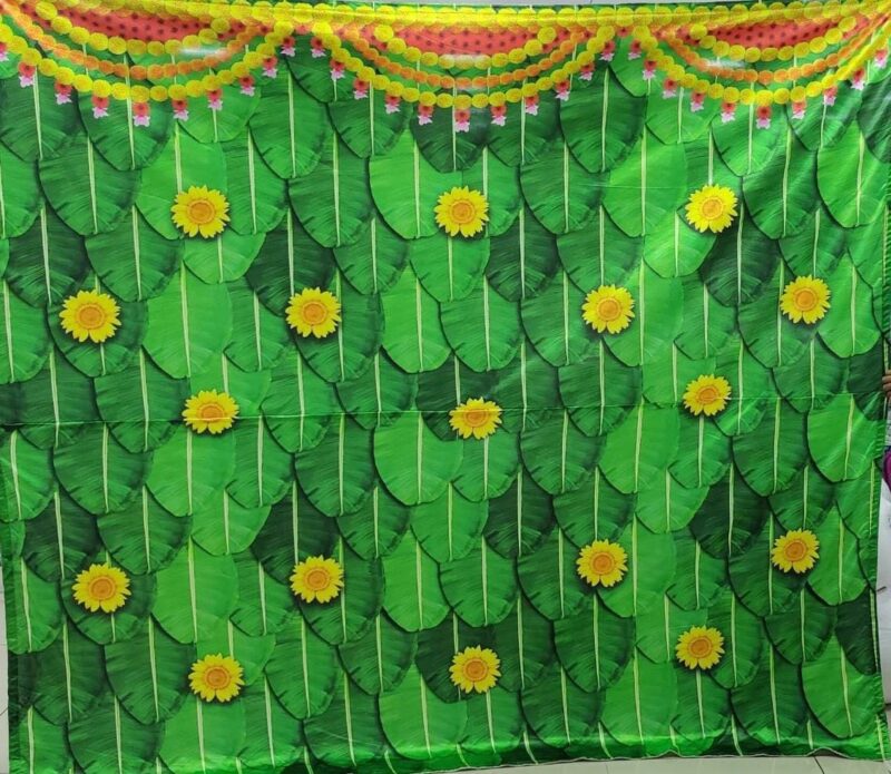 Backdrops for Home Decoration, Pooja, House Warming, Functions, Background Curtain for Pooja Decoration Wedding Backdrop Cloth for all Festivals/House hold functions/Haldi Function/Ceremonies Banana Leaf Design(Aaritaku) Design 5 Feet width * 8 Feet Length/Height