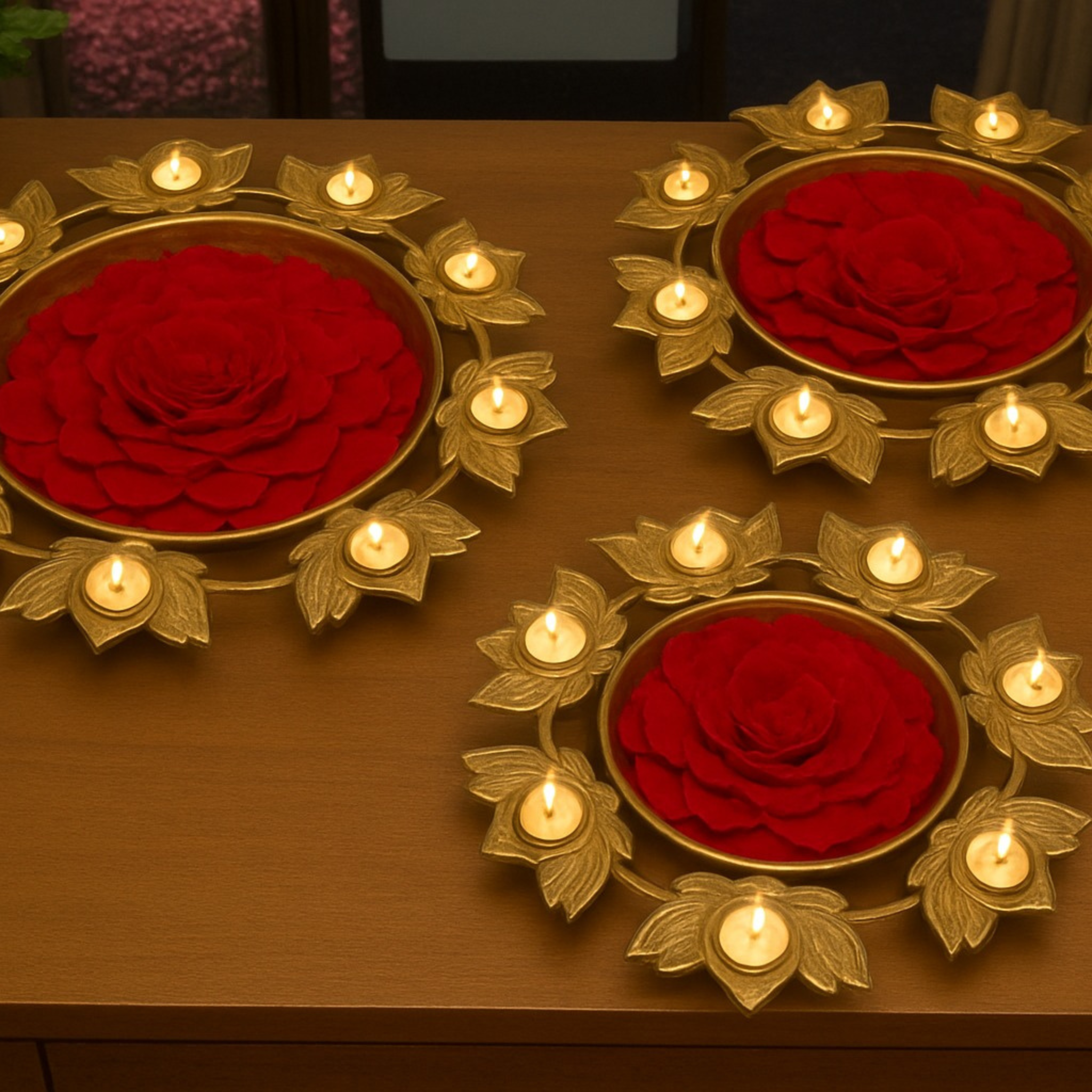 and diyas floating in the lotus urli creates a truly magical ambiance.