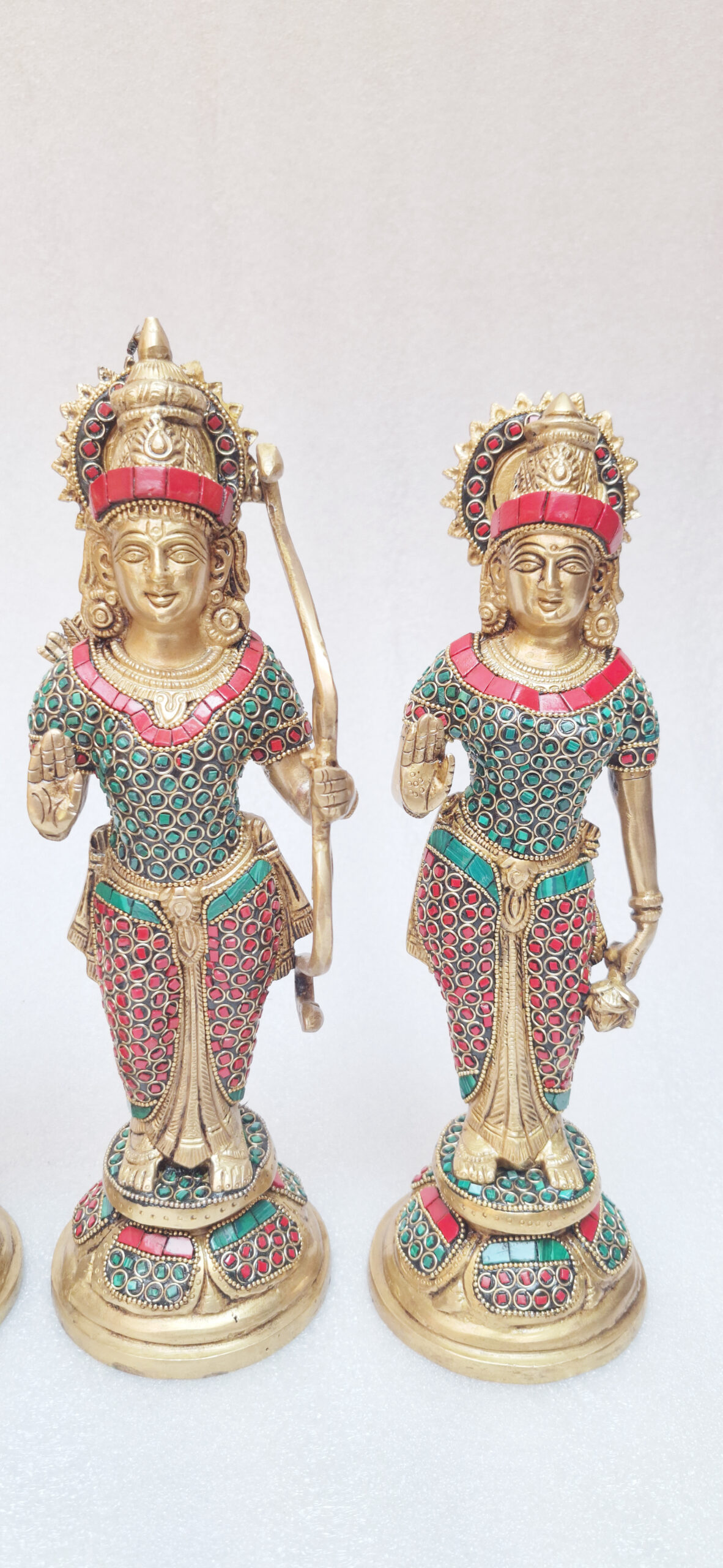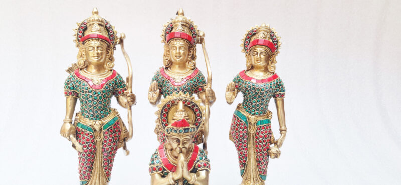 This Brass Ram Darbar statue elegantly portrays Lord Ram, Goddess Sita, Lord Lakshman, and Lord Hanuman, symbolizing divine harmony and virtues. Crafted from brass, it offers durability and a radiant finish, making it a cherished addition to any spiritual space.