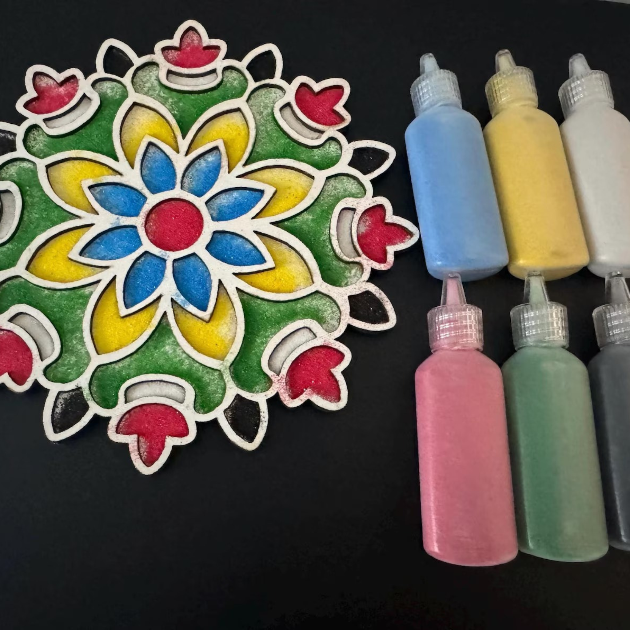 beautiful and intricate Rangoli designs. The reusable mat can be placed on any flat