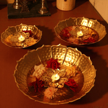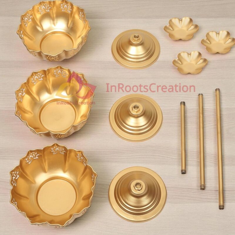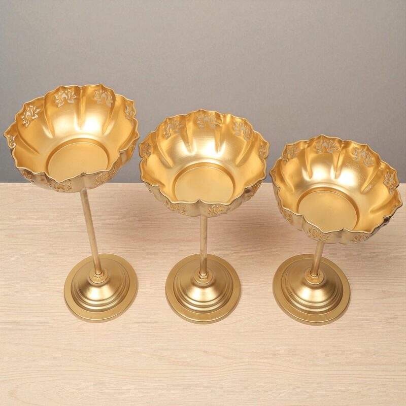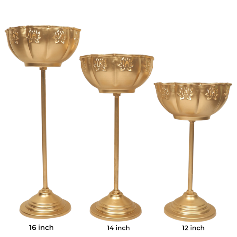 Elevate your home decor with these exquisite golden standing urli bowls that blend traditional artistry with modern elegance. Crafted with precision, each urli sits gracefully atop a tall pedestal stand, creating a striking and regal presence in any setting. The scalloped edges adorned with delicate lotus-inspired cutwork designs add a divine charm, while the radiant golden finish enhances their luxurious appeal. Unlike conventional table-top urlis, these standing urlis command attention with their height, making them ideal for decorating corners, entrances, or grand living spaces. Available in a set of three different sizes 12 inch, 14 inch and 16 inch these standing urli bowls offer versatility in styling.